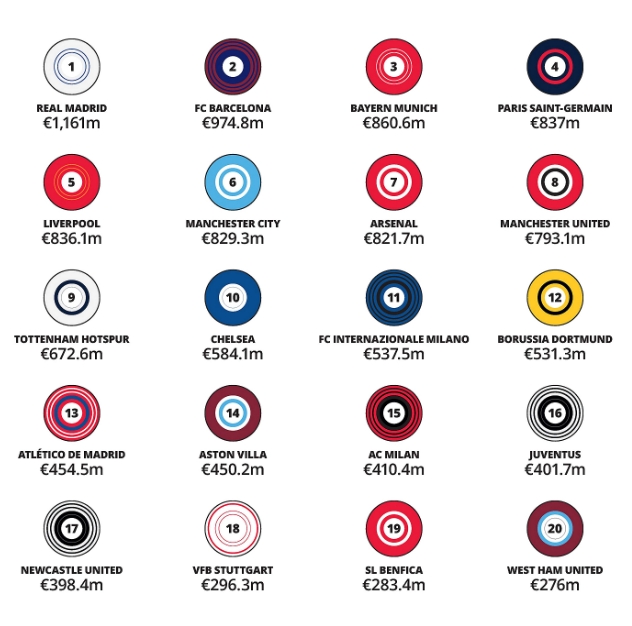 尽管转播收入可能已经被商业收入超越,但39.5亿镑总额仍是足球界的最大的收入来源之一。在这方面,皇马依然领先(2.81亿镑),紧随其后的是曼城(2.78亿镑)、阿森纳(2.69亿镑)和利物浦(2.69亿镑)。去年是欧冠新转播合同的丰收季,巴黎通过赢得夺得队史首座欧冠获得了创纪录的奖金,但由于法国国内转播收入较低,这方面总收入为2.46亿镑。